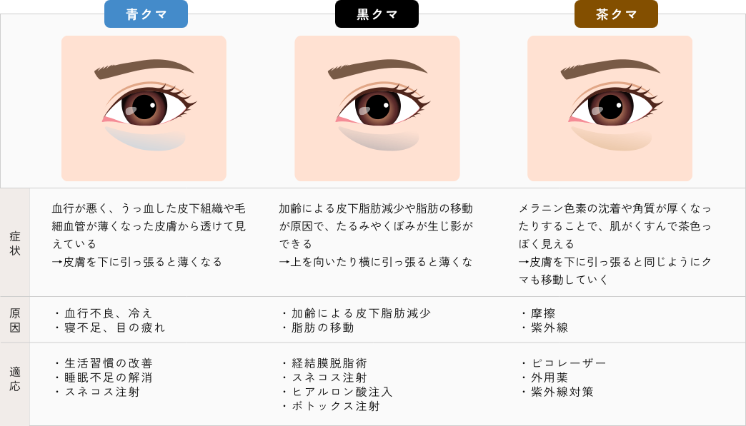 脂肪を除去したことで目立ちやすくなった小ジワには、スネコスを注入することでコラーゲン生成を促し、肌のハリ感を高めていきます。さらに、スネコス注射によって肌に厚みが生まれることで、皮下のうっ血が透けて見えることで生じる青クマの改善も期待できます。黒クマと青クマが重なっているケースにも対応しやすく、より高いエイジングケア効果を目指せる組み合わせです。